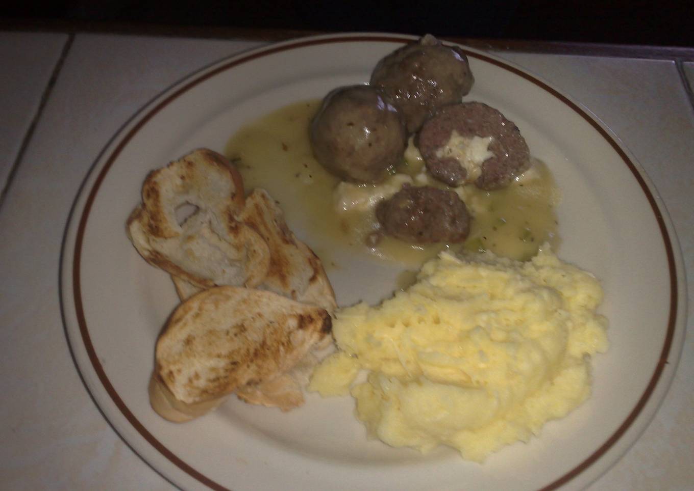 Unas albóndigas espectaculares con sorpresa de queso por dentro, acompañadas de puré de papas y pan tostado.