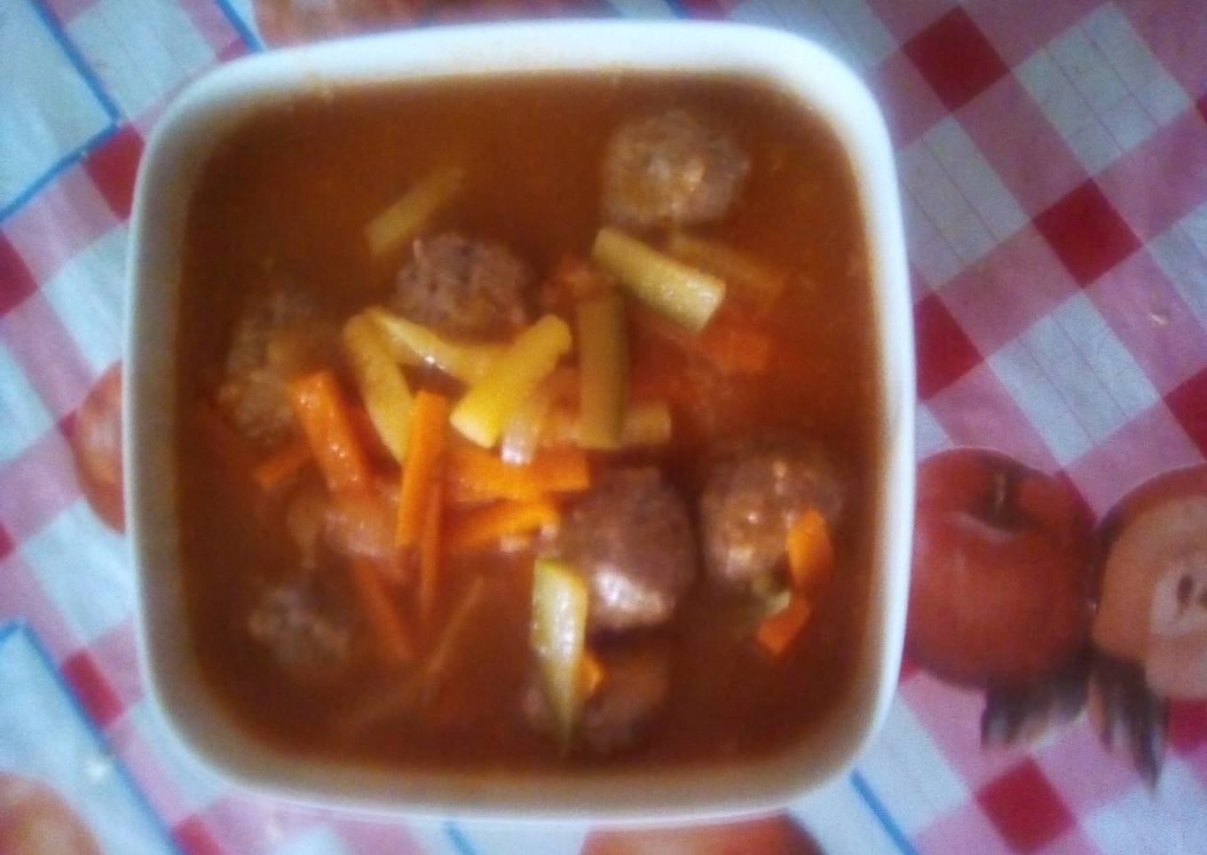 - Sofreír en una olla la cebolla en julianas, agregar la salsa, las tazas de agua y los cubitos de tomate, dejar que hierva y colocar las albóndigas en el caldo
